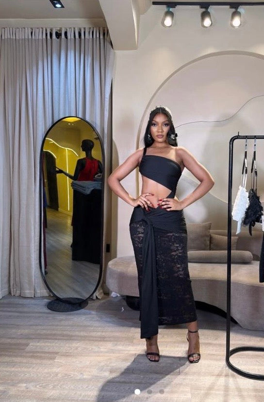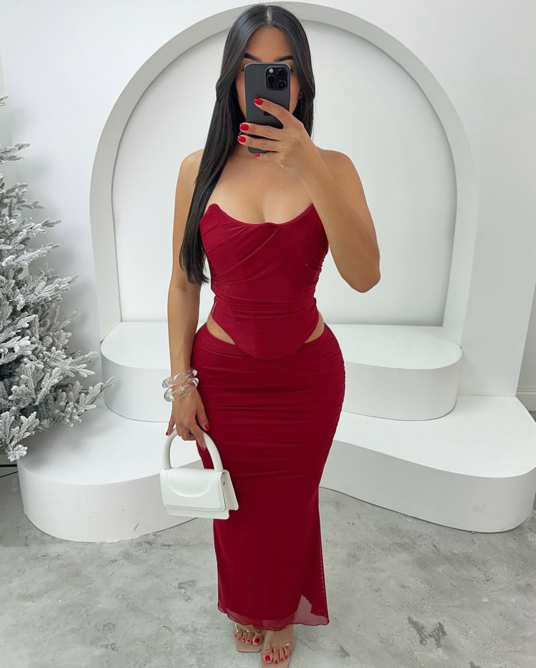 CJ10100# conjunto com crop top sem alças e saia longa justa