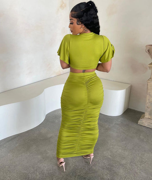 CJ80045# Conjunto de 2 peças de blusa e saia sexy com decote drapeado e costas nuas