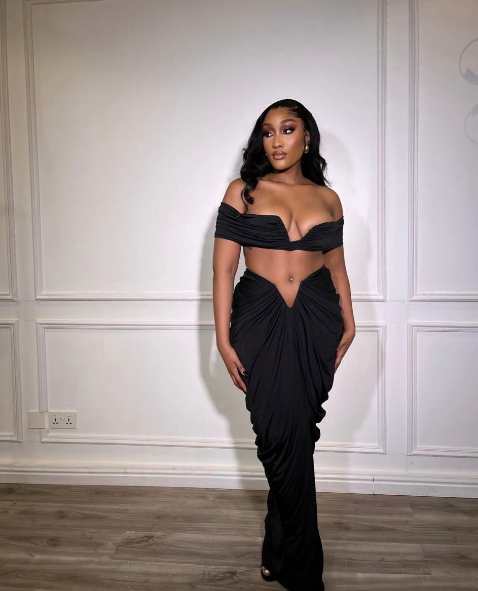 1724# V-neck top long ruched skirt V-belly