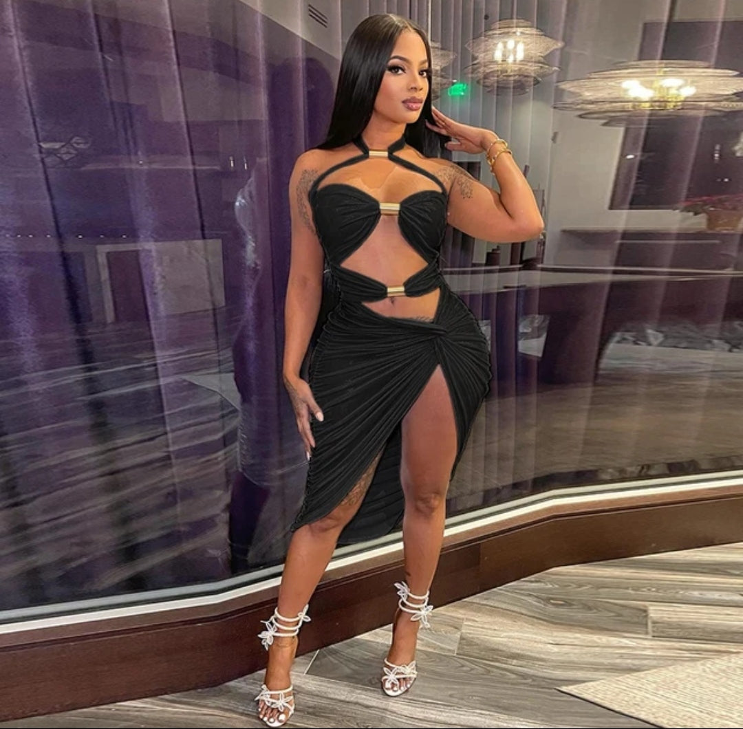 1917#Solid Twisted Knot & Ruched & High Slit Halter Neck Dress