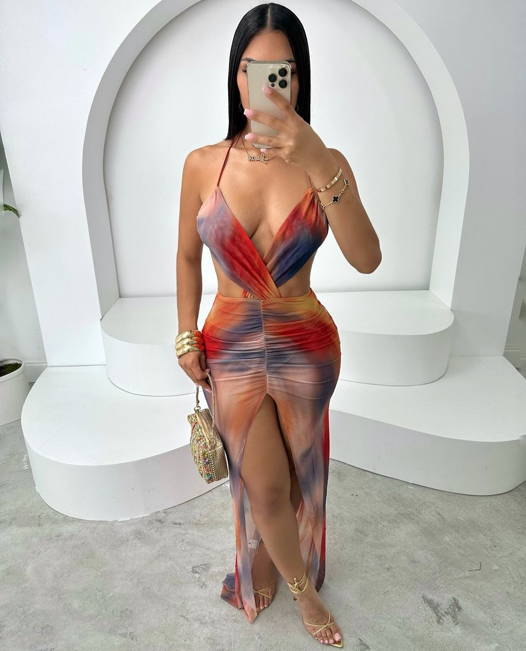 5001#vestido longo multicolor deconte em V