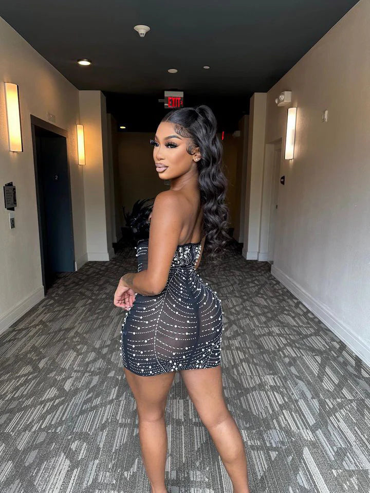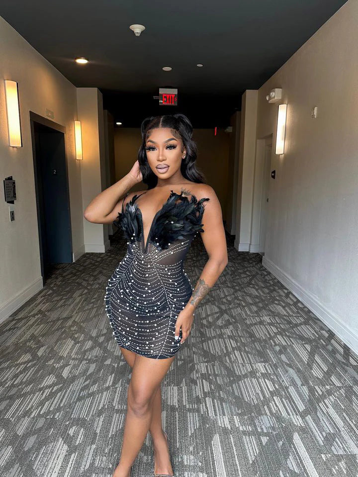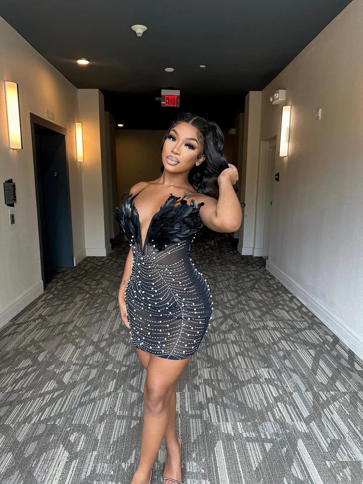 VM80010#Vestido sexy com decote em V profundo e penas falsas, ombro de fora, malha transparente e perfurada