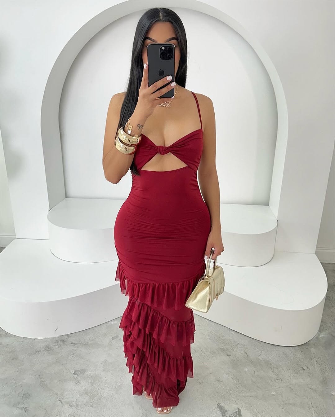 V1043# vestido longo justo com folhos
