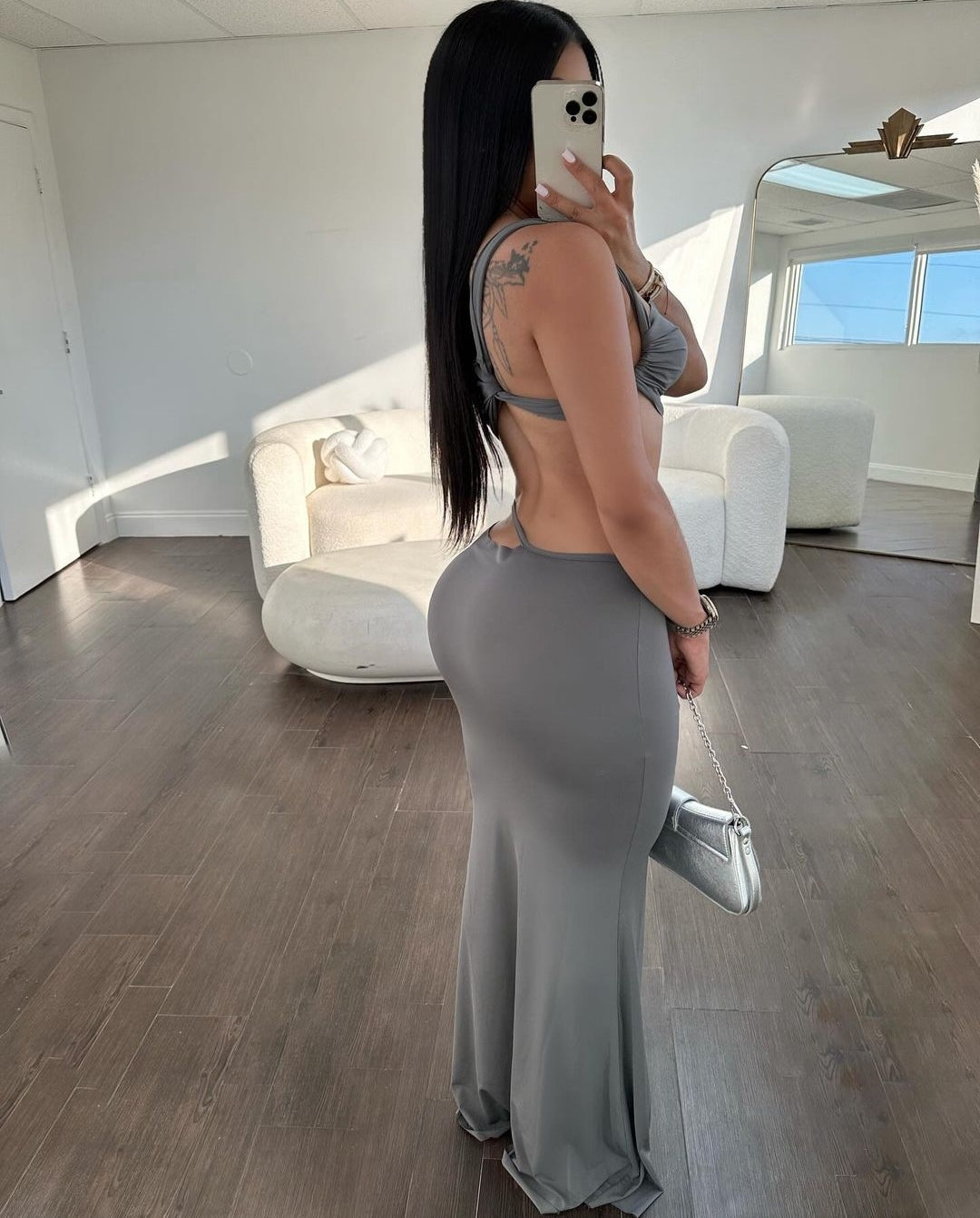 4024# Asymmetrical Neck Crop Top and Mermaid Hem Skirt Set Gray