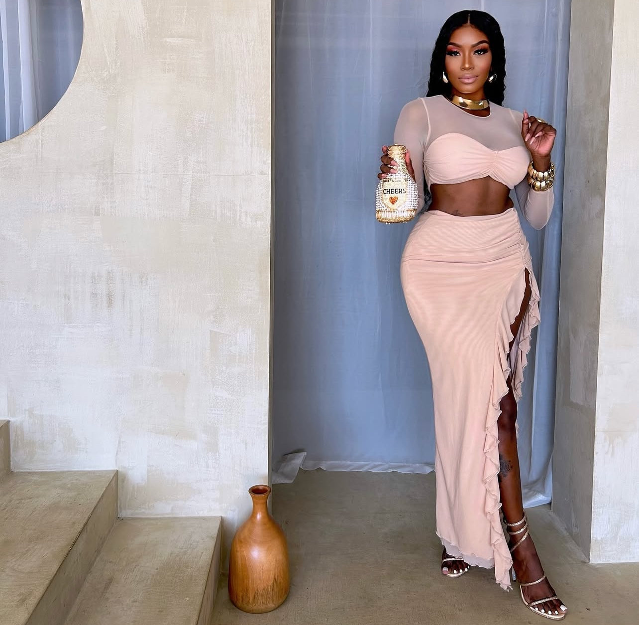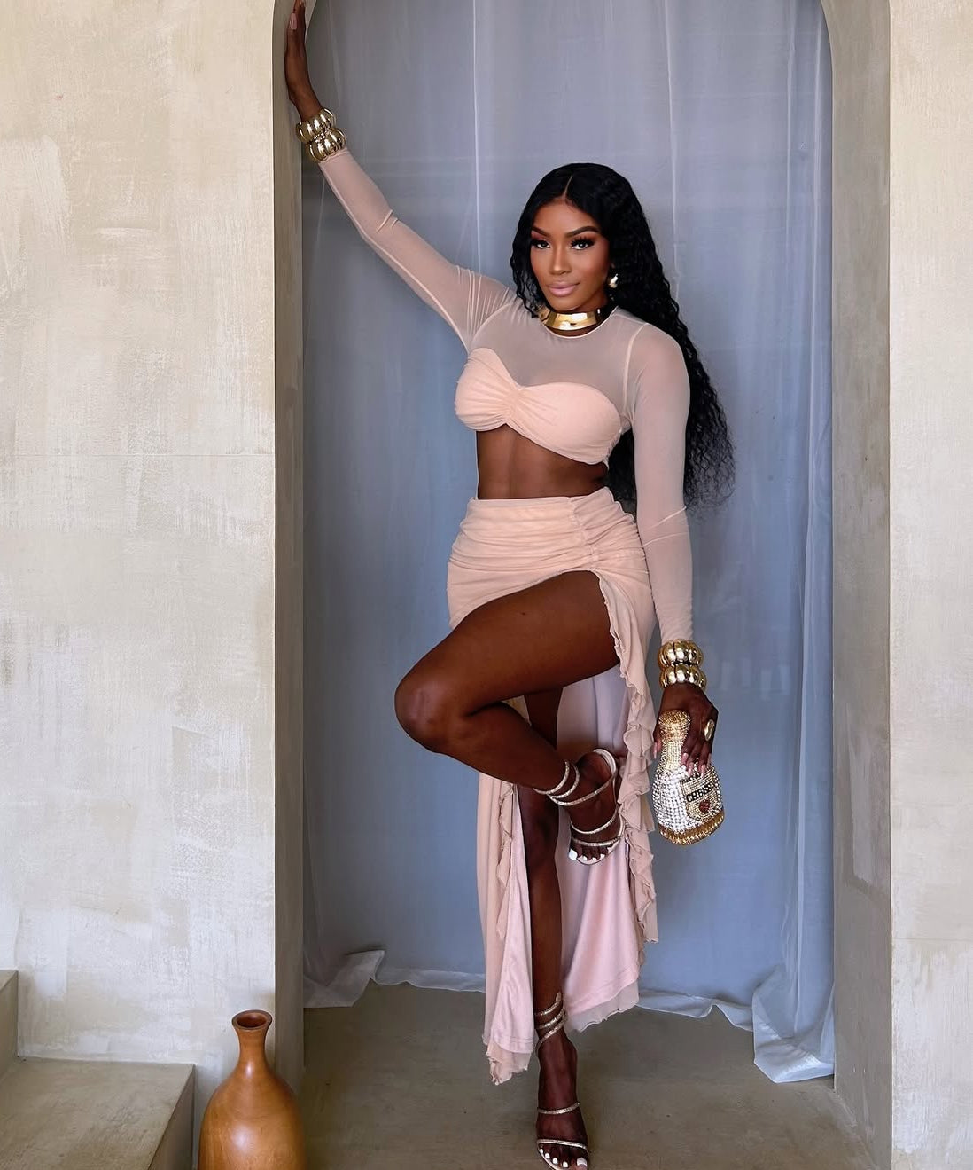 VL80042 Conjunto manga longa malha saia com alta fenda
