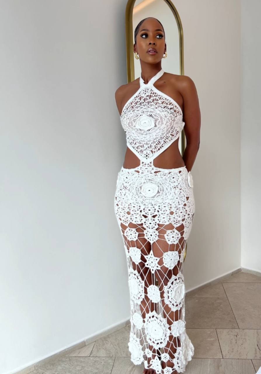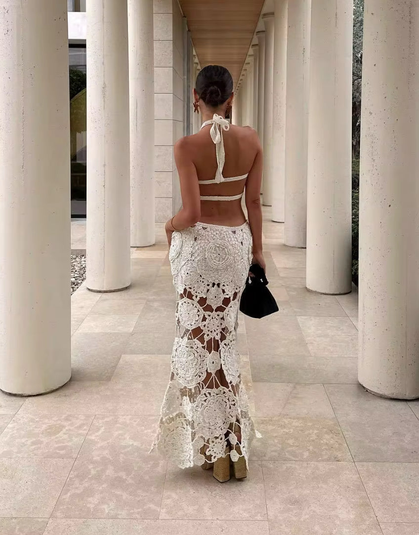 P80017# Vestido amarrado no pescoço com cobertura mini saia