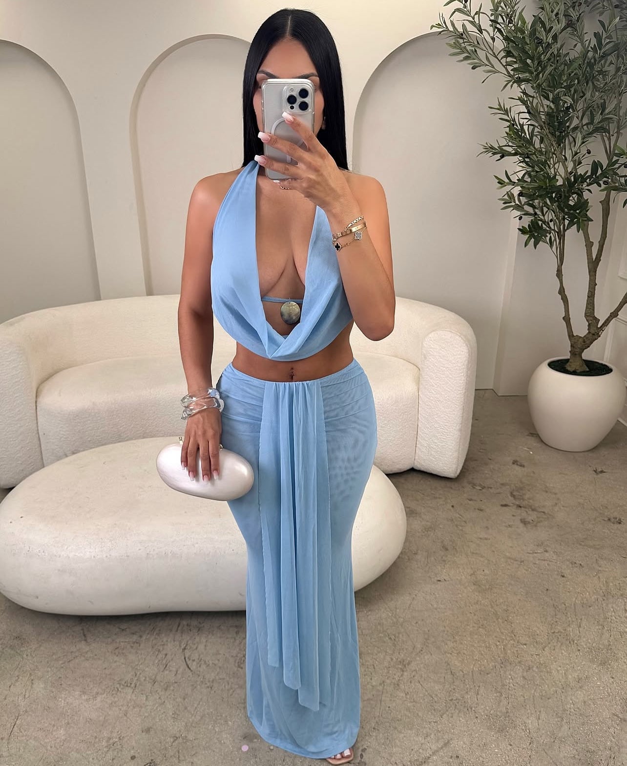 CJ80045# Conjunto de 2 peças de blusa e saia sexy com decote drapeado e costas nuas