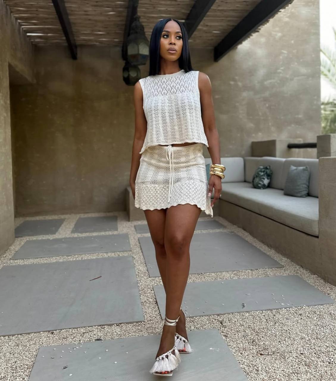 P80015# Conjunto elegante Praia Oco Semi-transparente Pulôver Sem mangas Tricô Top Saia curta